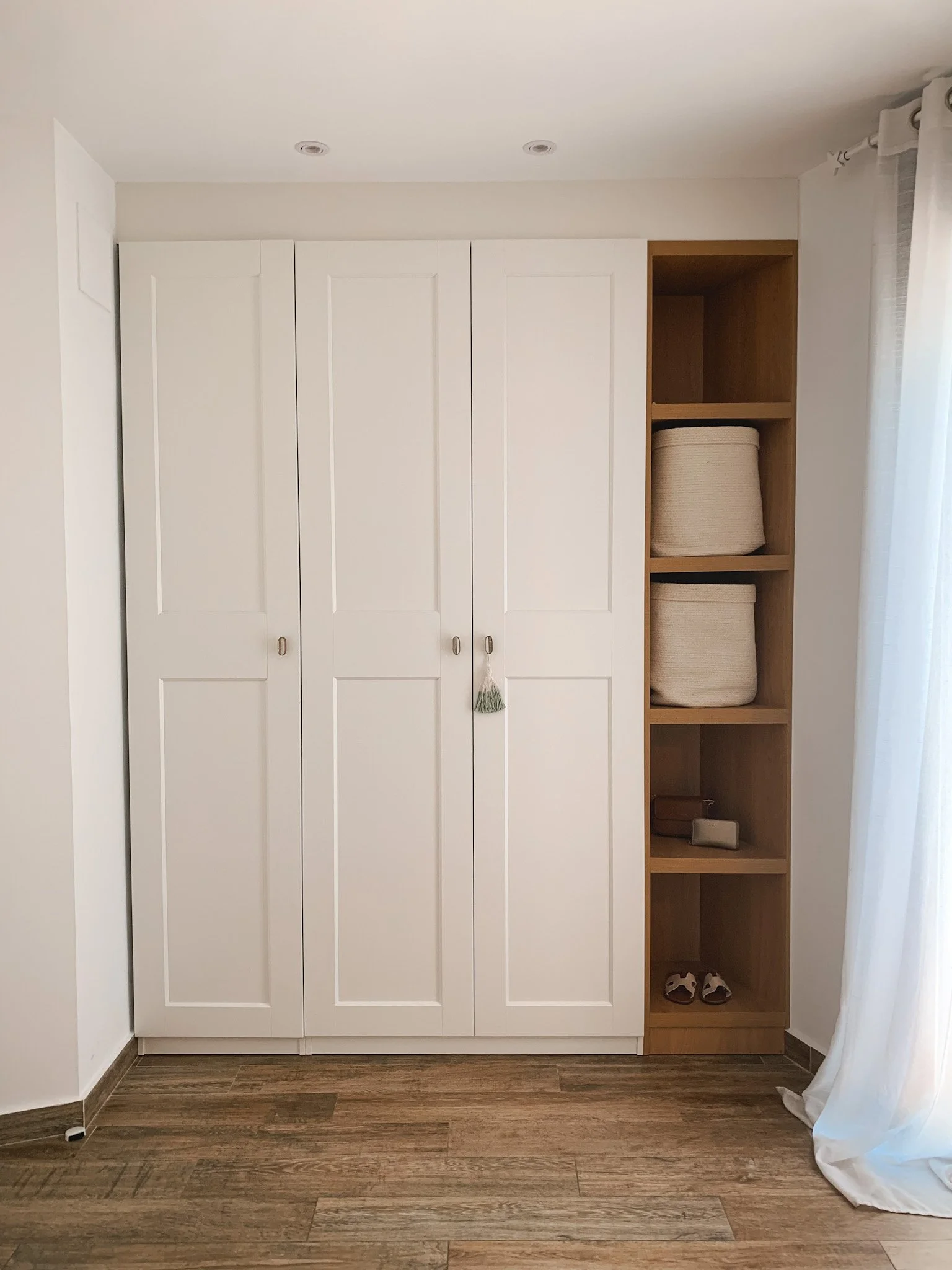 Incorporamos una cama nido, que permite tener una segunda cama lista para invitar a las amigas sin sacrificar espacio durante el día. Y también construimos un armario a medida al otro lado de la habitación con muchísima capacidad de almacenaje y que se integra perfectamente en el ambiente.