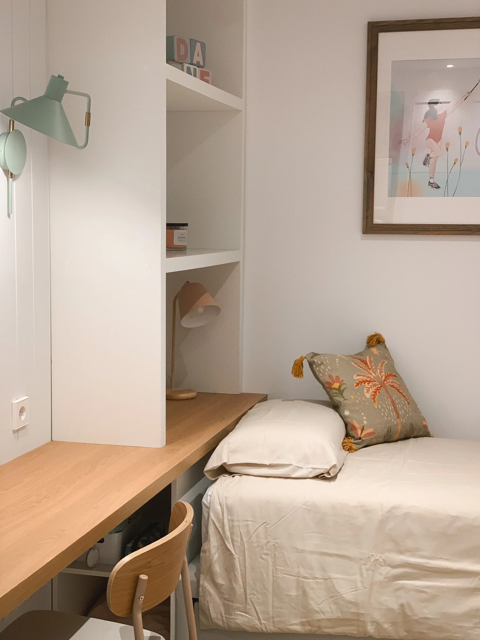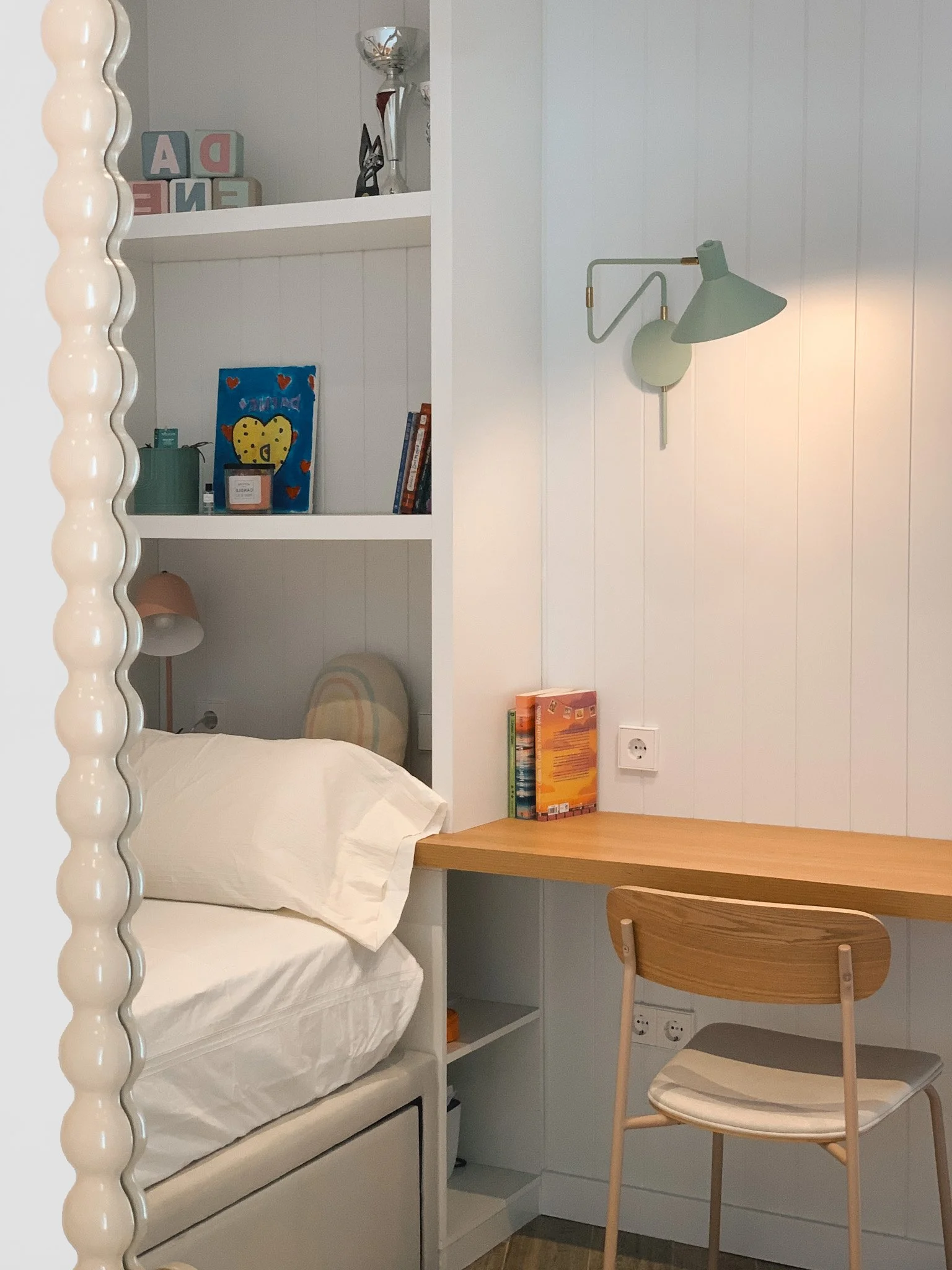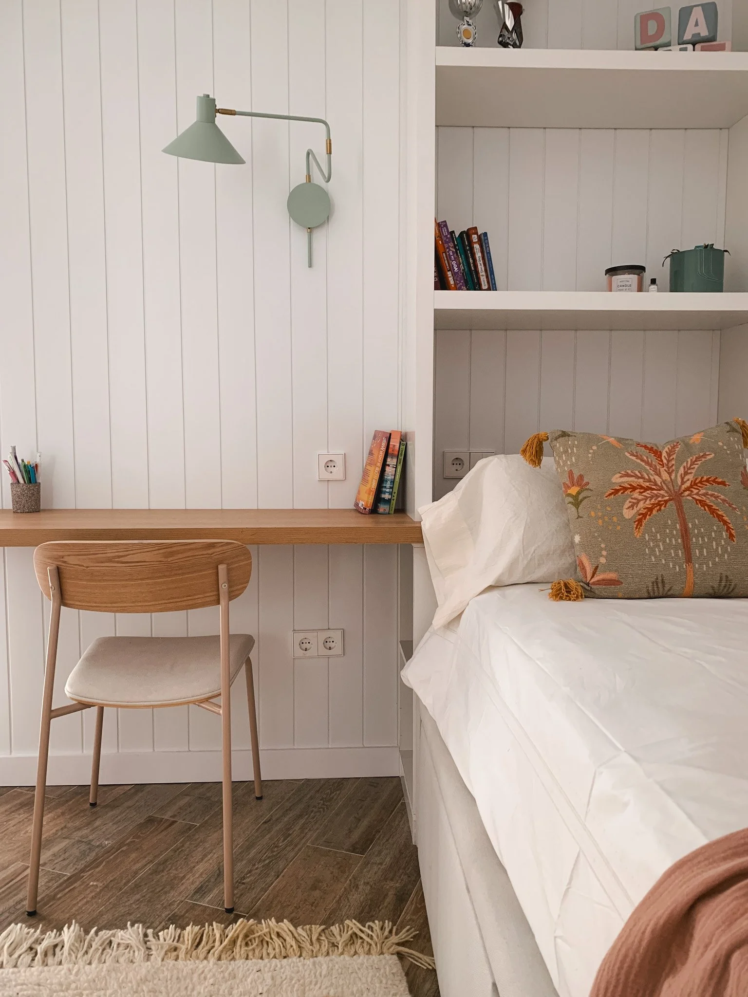 Uno de los grandes aciertos fue incorporar panelado de madera en la pared, que añade textura y da un aire más cálido y escandinavo al cuarto. La paleta de colores; blanco que aporta muchísima luminosidad y toques de color en verde menta, colores tierra y mostaza, que refuerzan esa sensación de frescor y a su vez calma. Los detalles decorativos, como los cojines con bordados y las ilustraciones, terminan de darle personalidad al espacio sin sobrecargar.