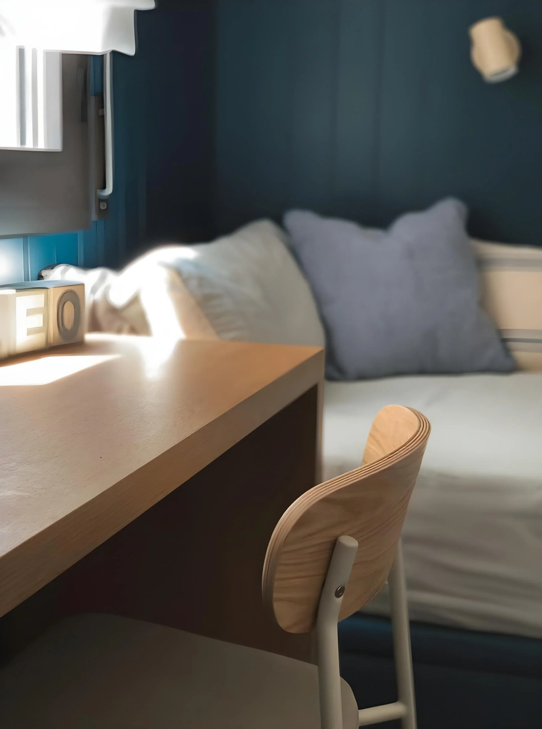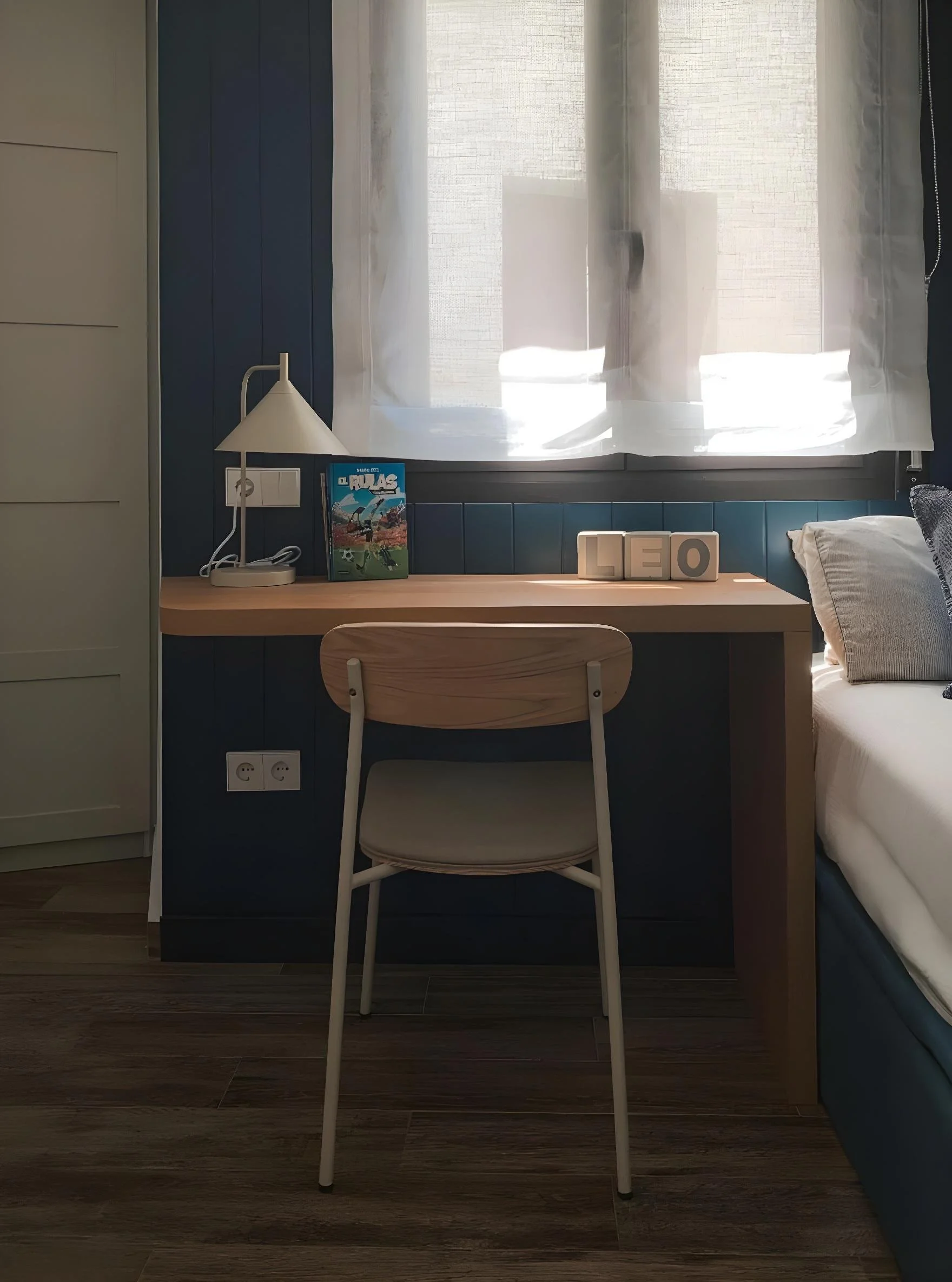 Pero si hay algo que da alma a esta estancia, es el panelado en DM lacado azul. Su tono profundo envuelve el espacio con calidez y carácter, mientras que los textiles y detalles en colores suaves —como el aplique o el cuadro— aportan equilibrio y frescura. El resultado: una habitación funcional, acogedora y llena de personalidad, donde el diseño convierte lo pequeño en extraordinario.