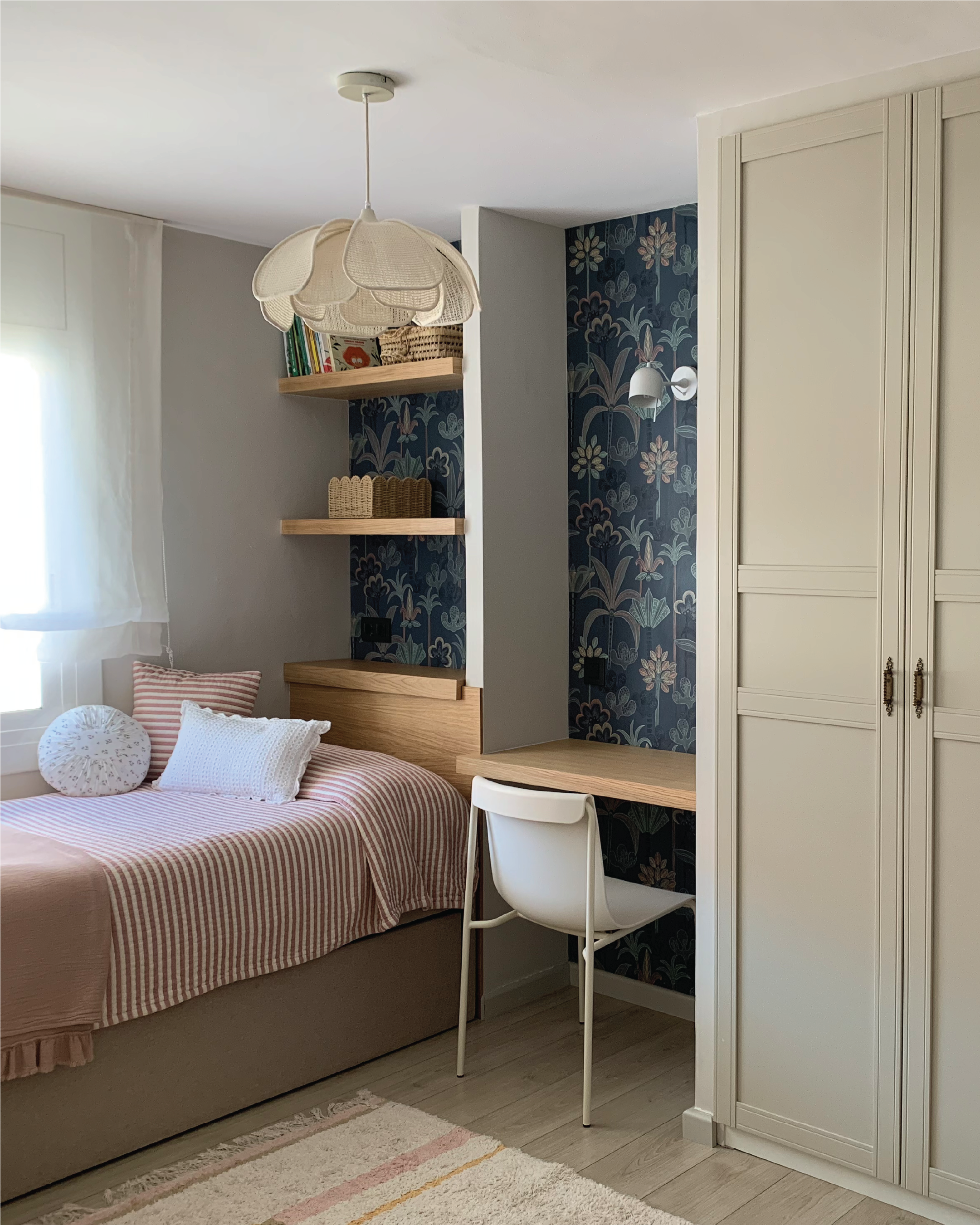 La zona de estudio, integrada junto a la cama, es perfecta para leer, dibujar o hacer los deberes. Detalles como la lámpara de fibras naturales, las cestas decorativas, los cojines y la ropa de rayas en rosa empolvado y blanco equilibran el conjunto aportando un toque romántico a la vez que infantil.
