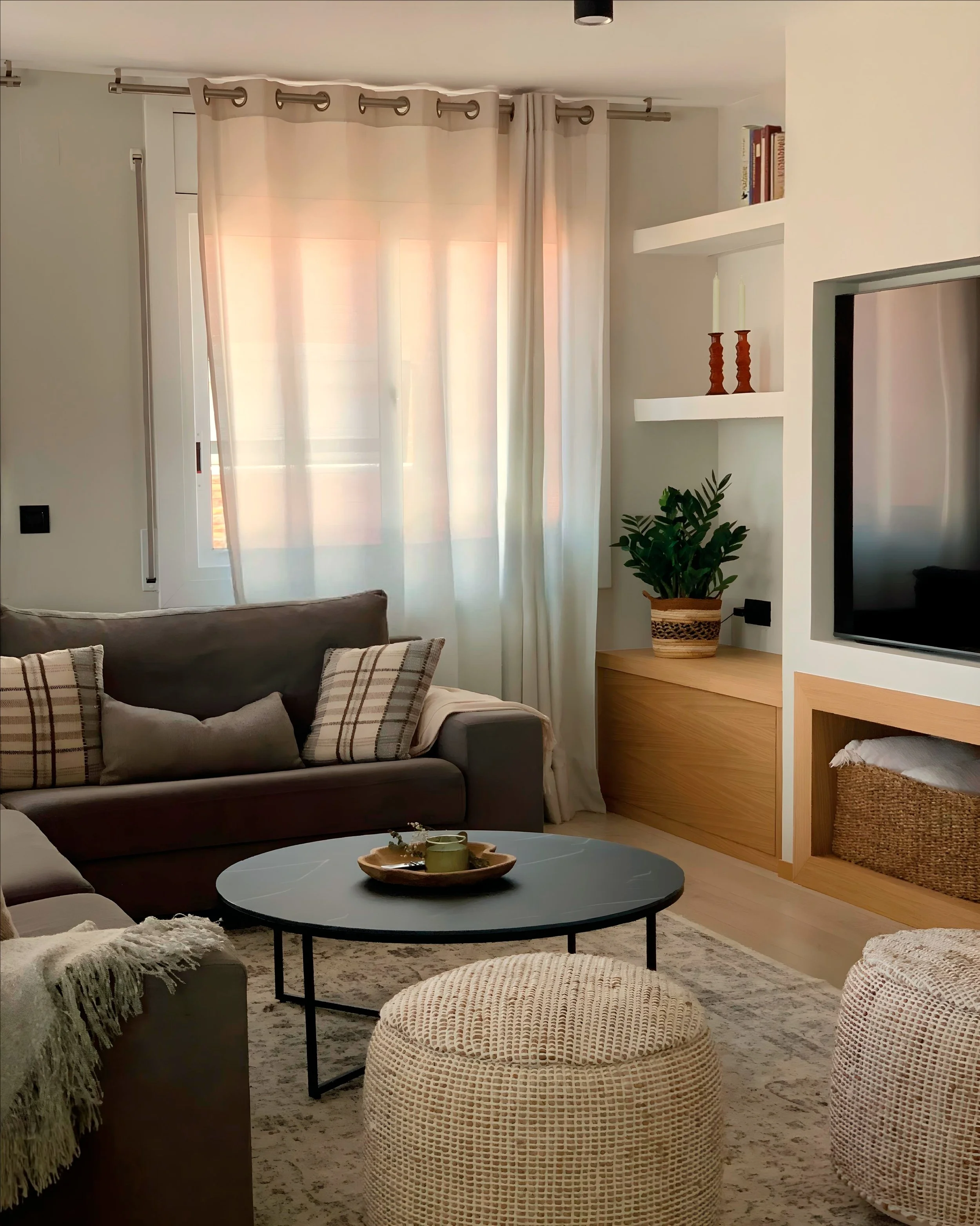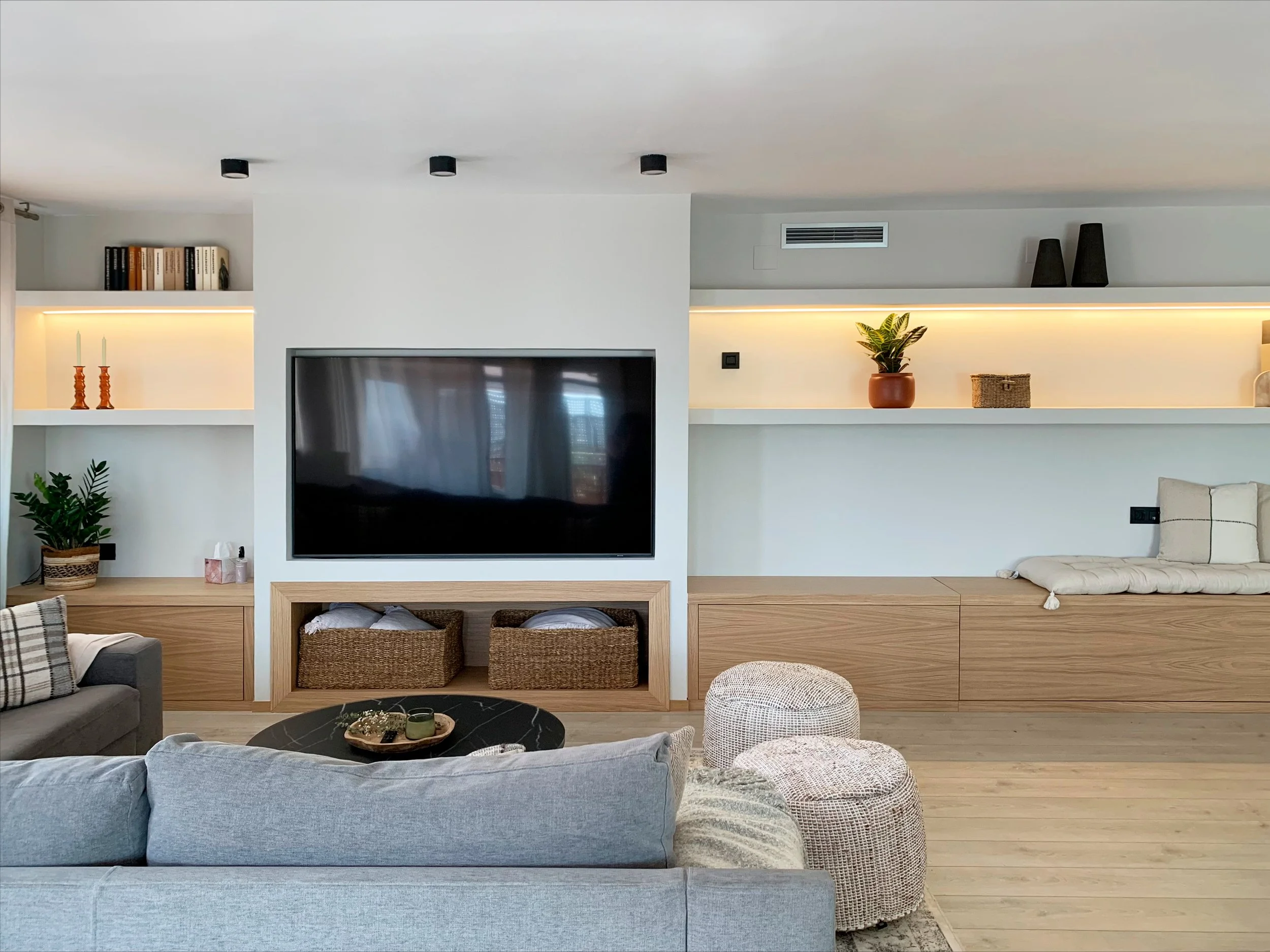La gran protagonista del salón es, sin duda, esta pared multifuncional que lo tiene todo. En el centro, un cajón de pladur enmarca el televisor y lo integra con estilo, mientras que en la parte inferior, un hueco revestido en madera con dos cestas decorativas aporta calidez y practicidad.