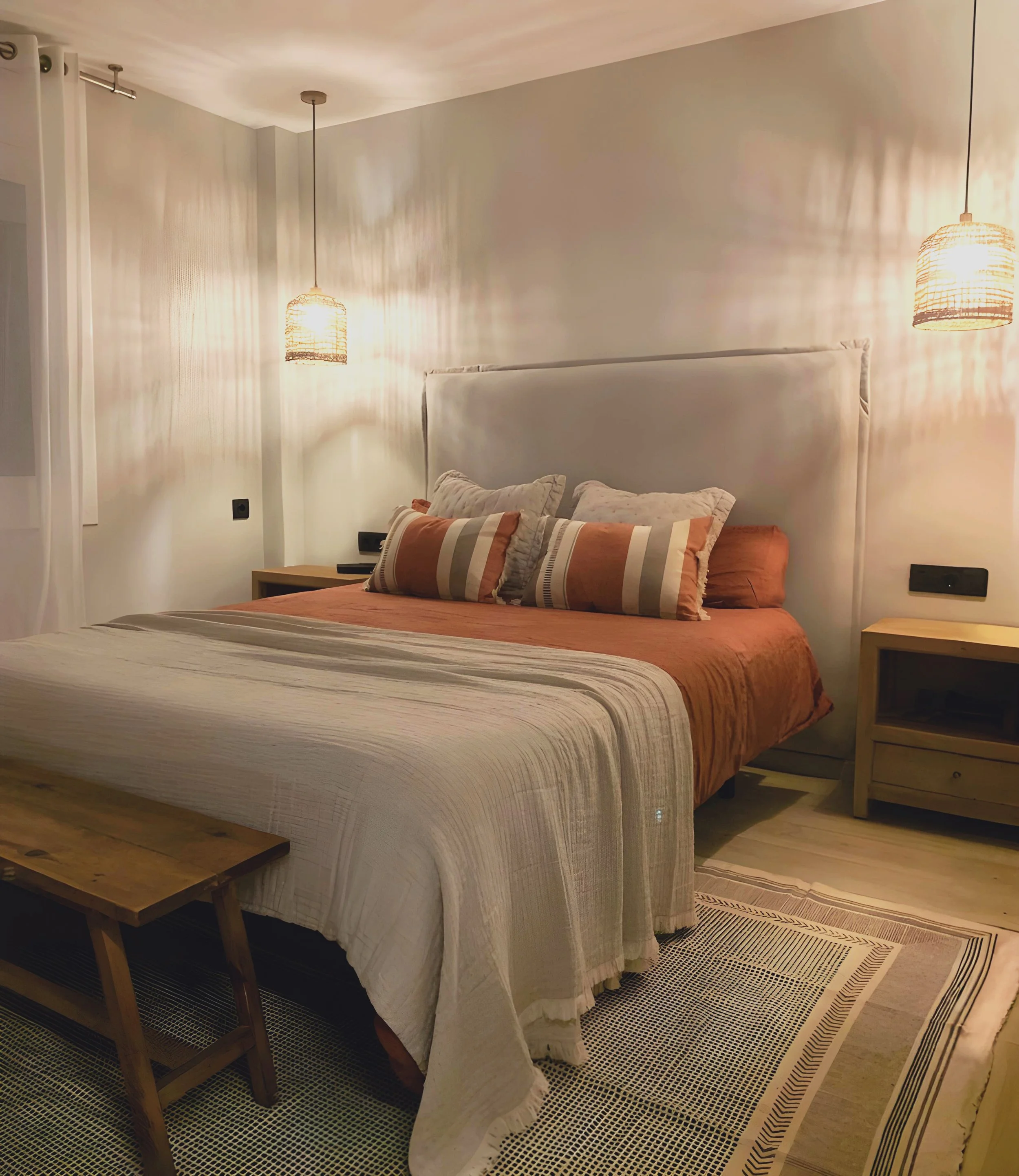 Mantuvimos los armarios empotrados existentes a los que simplemente cambiamos los tiradores, por unos de diseño minimalista. La cama, con textiles en terracota y beige, invita a relajarse desde el primer vistazo. Y para sumar calidez, optamos por lámparas colgantes de fibras naturales creando una luz suave que transforma por completo el ambiente.